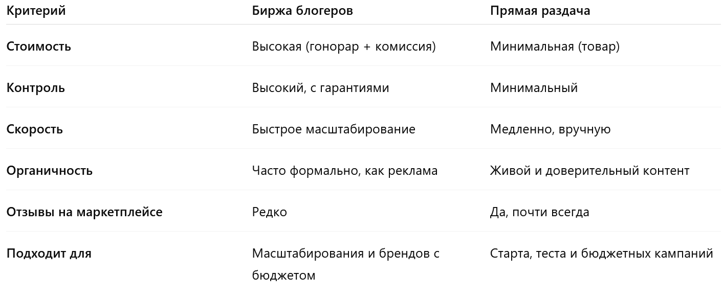 - Комбинированный подход. Селлеры всё чаще используют и биржу, и прямую раздачу: биржа даёт масштаб, бартерные блогеры — доверие.